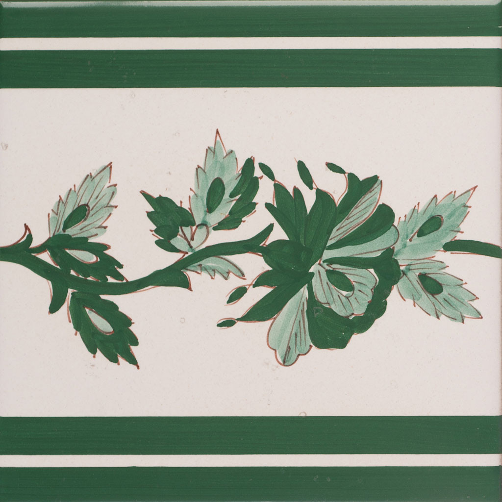 "20x20 Bordura mattonella decorata a mano, inseribile come chiusura a rivestimento o pavimento. Realizzabile nei 42 colori in gamma e abbinabile con Pennellati e Bianco Antico, decoro Cachemire. Il colore di riferimento è il verde 631. Adeguate rifiniture per i decori abbinati."