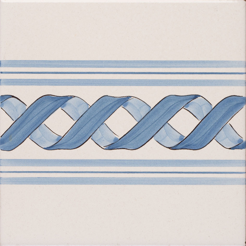 "20x20 Bordura mattonella decorata a mano, inseribile come chiusura a rivestimento o pavimento. Realizzabile nei 42 colori in gamma e abbinabile al decoro Quadretti. Il colore di riferimento è il giallo 5. Adeguate rifiniture per i decori abbinati."