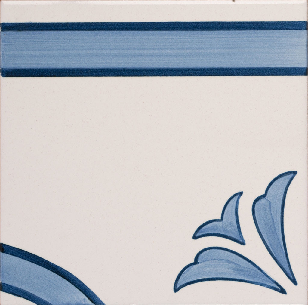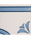"20x20 Bordura mattonella decorata a mano, inseribile come chiusura a rivestimento o pavimento, terminale destro. Realizzabile nei 42 colori in gamma e abbinabile al decoro Corfù. Il colore di riferimento è il 300 azzurro e blu 451. Adeguate rifiniture per i decori abbinati."
