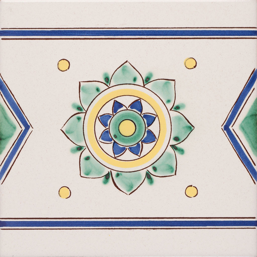 "20x20 Bordura mattonella decorata a mano, inseribile come chiusura a rivestimento o pavimento. Realizzabile in verde 140, giallo 4, blu 325 e abbinabile al decoro Fioroni.