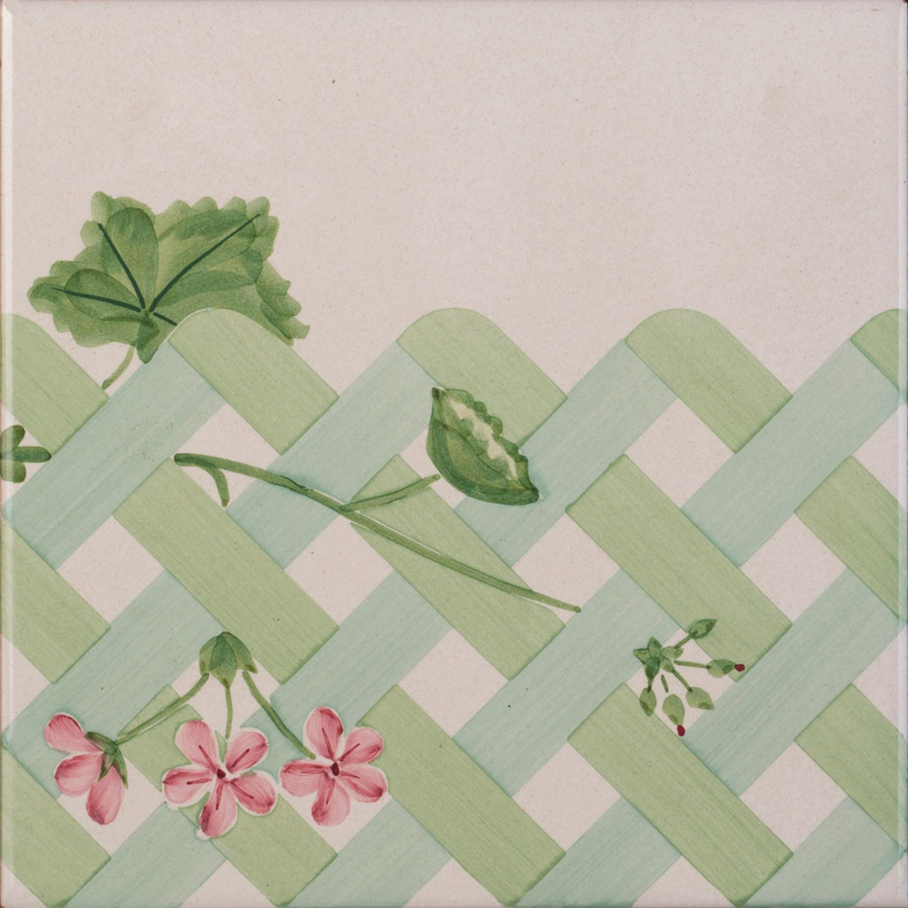 "20x20 Bordura mattonella decorata a mano, inseribile come chiusura a rivestimento o pavimento, terminale destro. Realizzabile nei 42 colori in gamma e abbinabile al decoro Cestino. Il colore di riferimento è il rosa 357. Adeguate rifiniture per i decori abbinati."