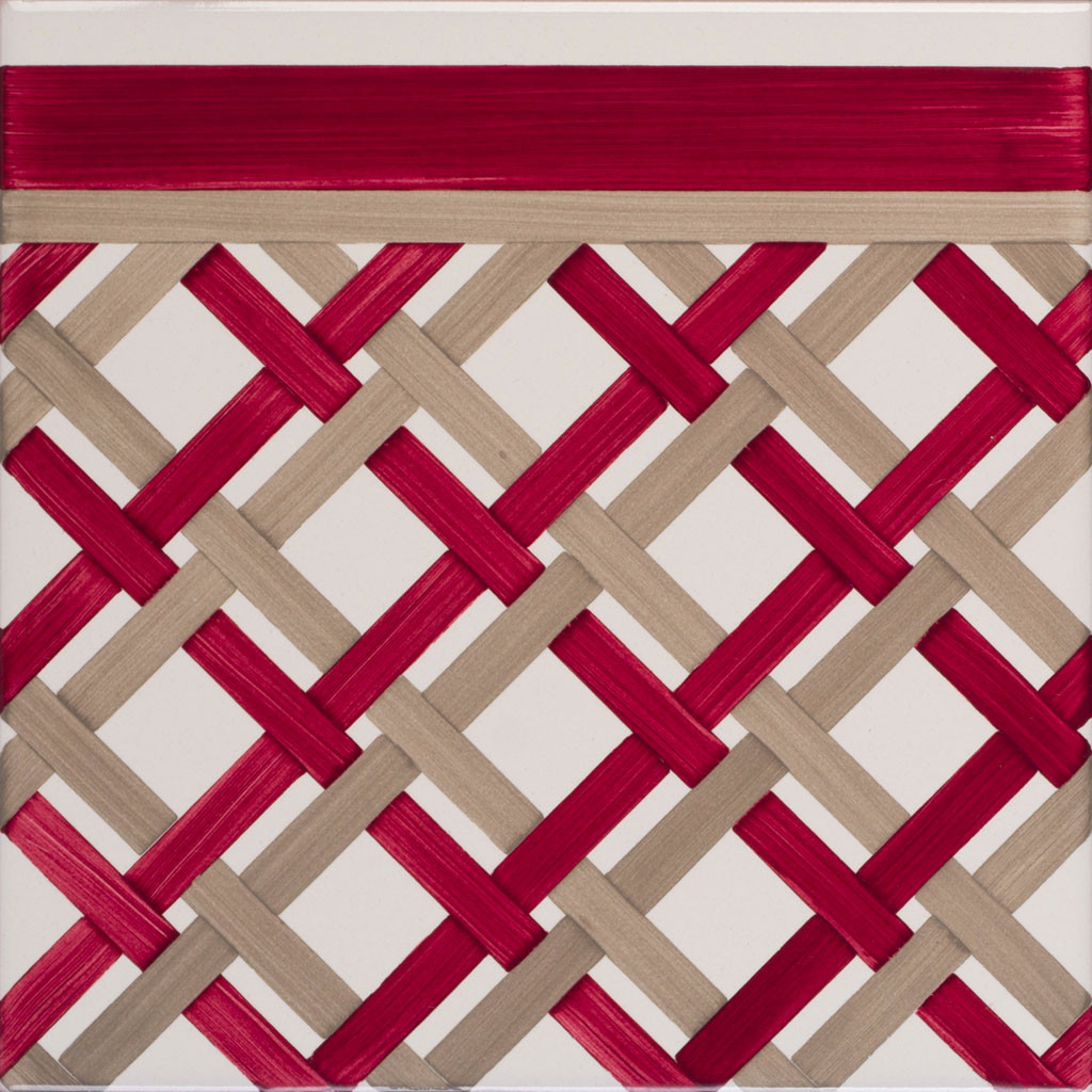 "20x20 Bordura mattonella decorata a mano, inseribile come chiusura a rivestimento. Realizzabile nei 42 colori in gamma e abbinabile al decoro Intreccio.