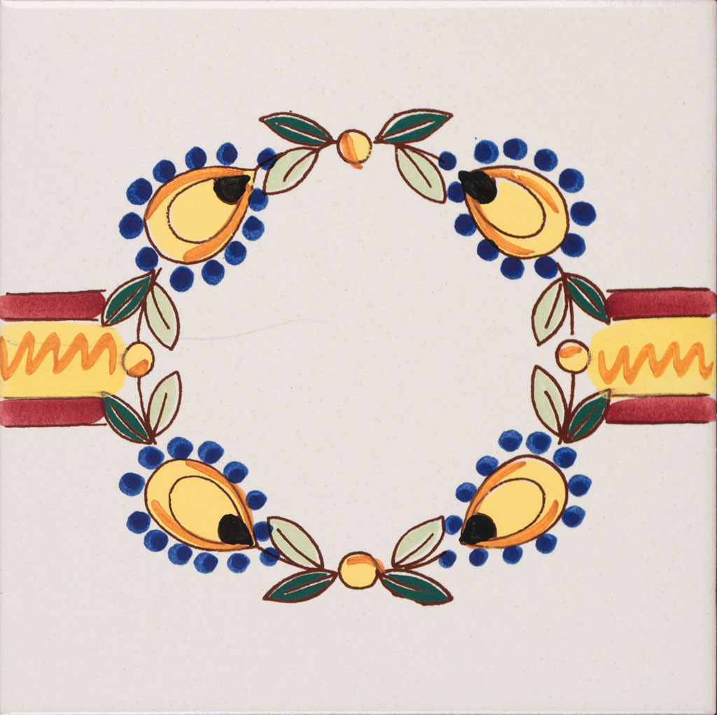 "20x20 Bordura mattonella decorata a mano, inseribile come chiusura a rivestimento o pavimento. Realizzabile in blu 325, in giallo 279,ocra 5, rosa //A e abbinabile al decoro Lauro o Bianco Antico.
