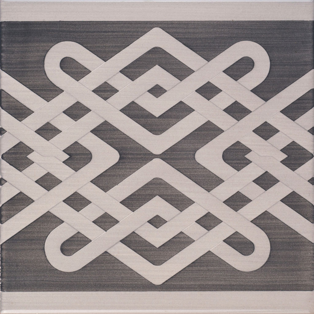 "20x20 Bordura mattonella decorata a mano, inseribile come chiusura a rivestimento o pavimento. Realizzabile nei 42 colori in gamma e abbinabile con Pennellati e Bianco Antico. Il colore di riferimento è il grigio 417 e il grigio 313. Adeguate rifiniture per i decori abbinati."