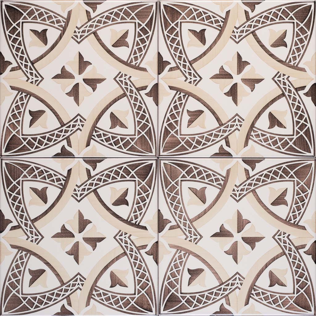 20x20 Mattonella decorata a mano, da posare a pavimento e rivestimento. Realizzabile nei 42 colori in gamma e abbinabile al pennellato e bianco antico. Magico intreccio che ricorda la fioritura. Il colore di riferimento è il 996 manganese, 378 avana.