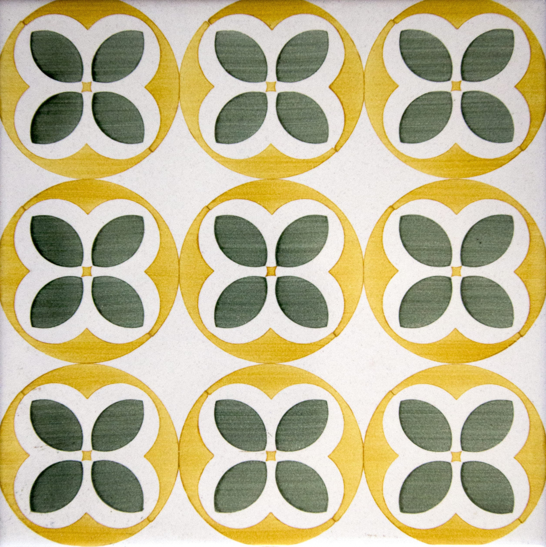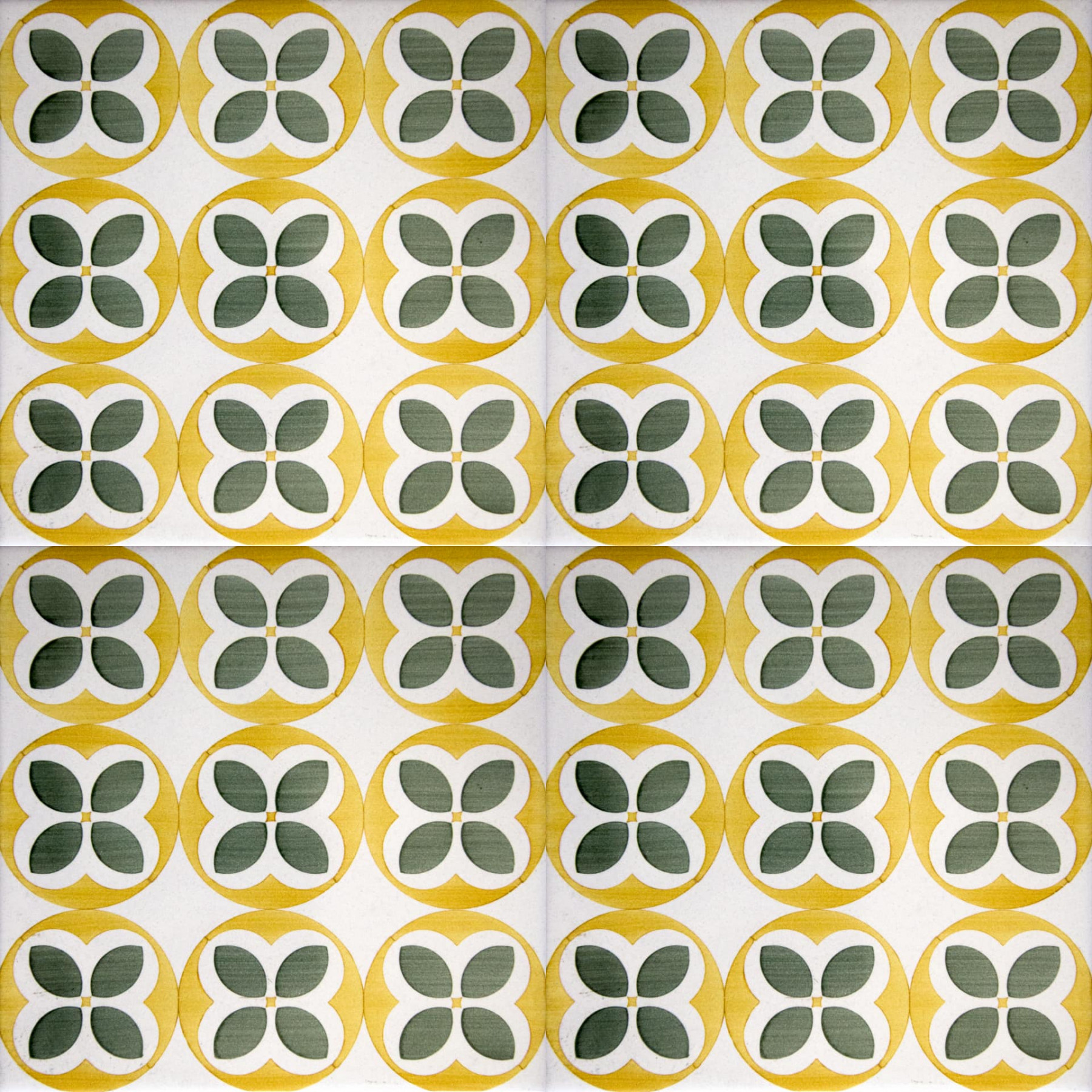 20x20 Mattonella decorata a mano, da posare a pavimento e rivestimento. Realizzabile nei 42 colori in gamma e abbinabile al pennellato e bianco antico. Magico intreccio che ricorda la fioritura. Il colore di riferimento è il 130 e 279.