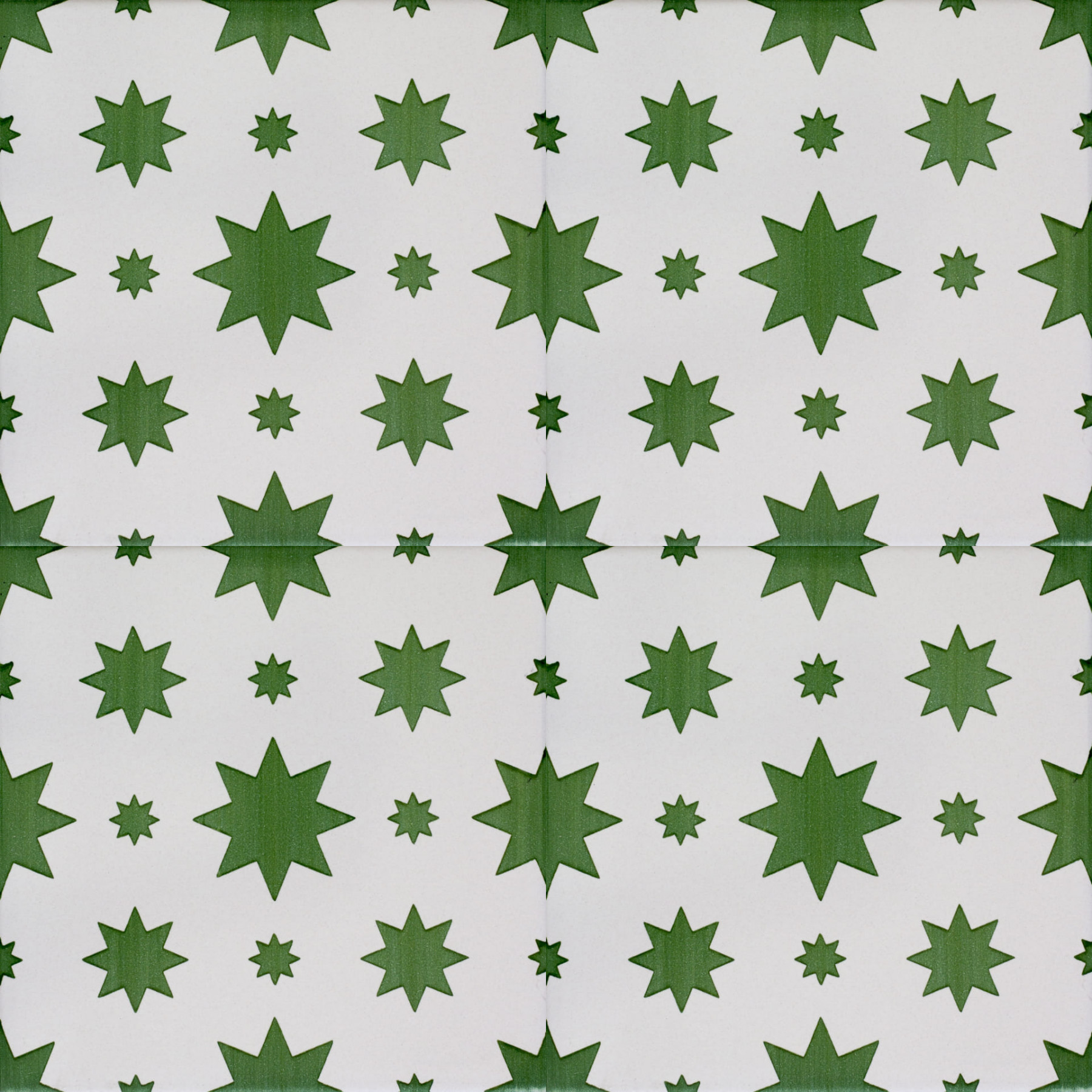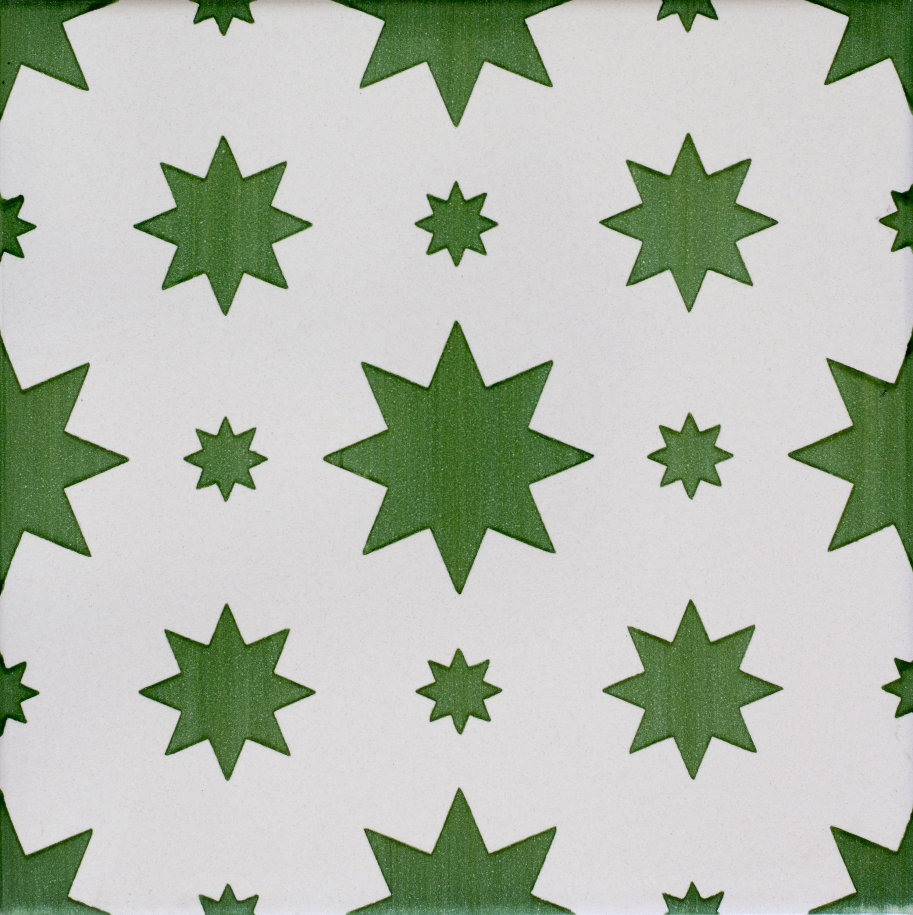 20x20 Mattonella decorata a mano, da posare a pavimento e rivestimento. Realizzabile nei 42 colori in gamma e abbinabile al pennellato e bianco antico. Una dolce pioggia di stelle. Il colore di riferimento è il verde 675.