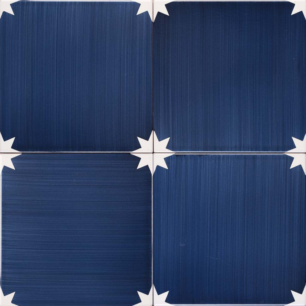 20x20 Mattonella decorata a mano, da posare a pavimento e rivestimento. Realizzabile nei 42 colori in gamma e abbinabile al pennellato e bianco antico. Una dolce pioggia di stelle. Il colore di riferimento è il blu 451.