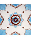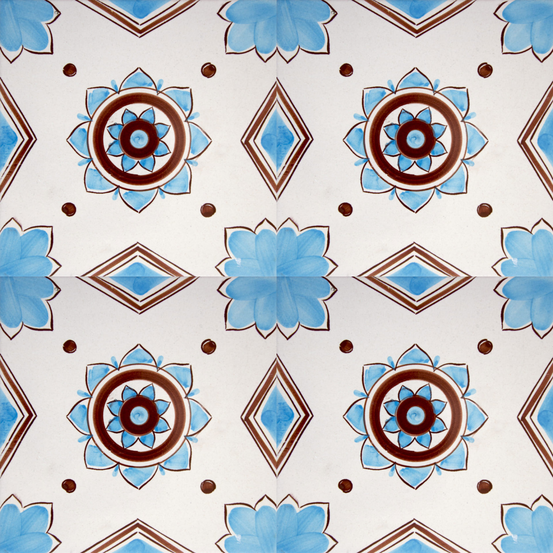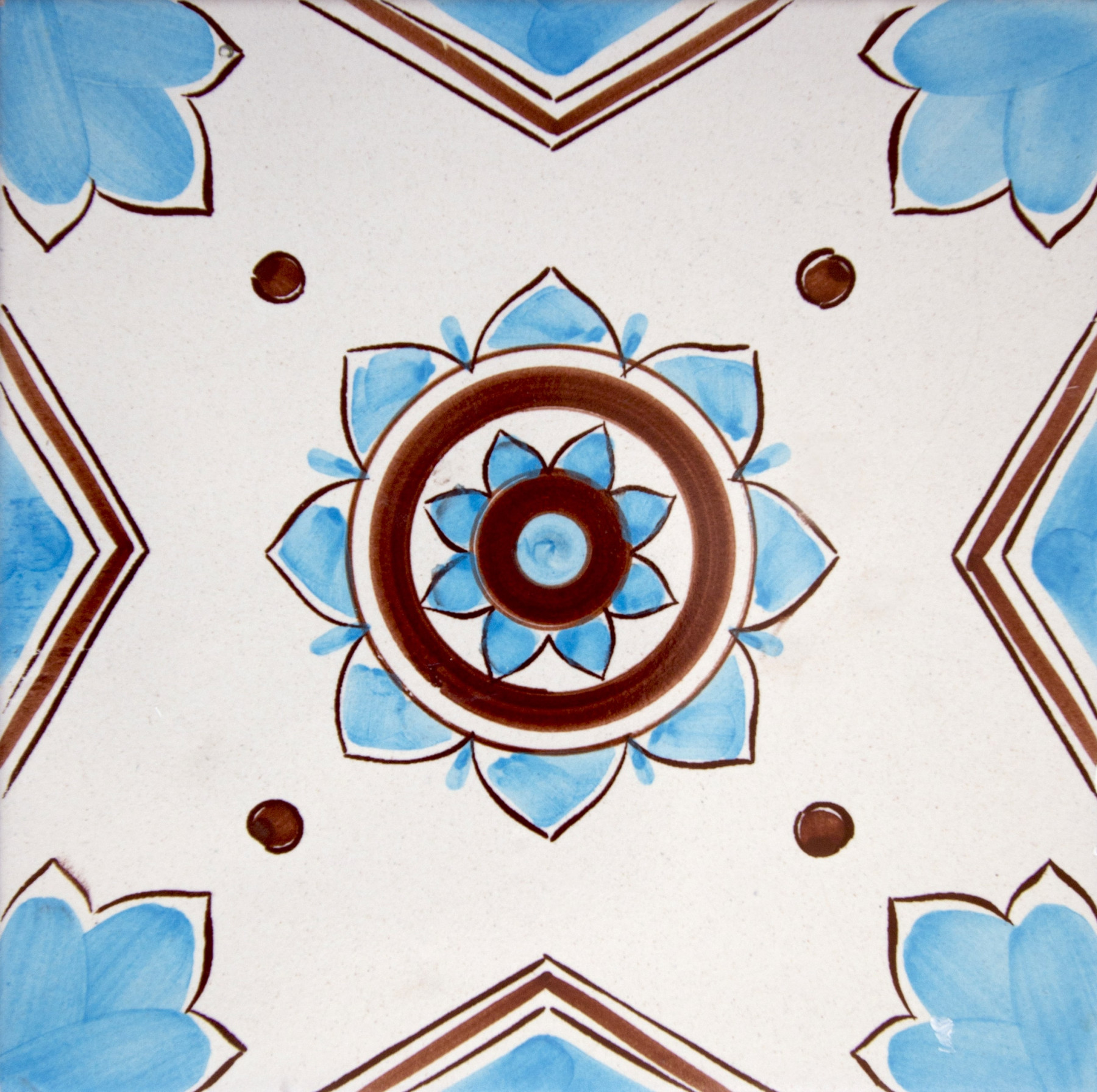 20x20 Mattonella decorata a mano, da posare a pavimento e rivestimento. Realizzabile nei 42 colori in gamma e abbinabile al pennellato e bianco antico. Fiori incorniciati da stupende geometrie. Il colore di riferimento è il 168 turchese e il marrone 422.