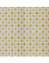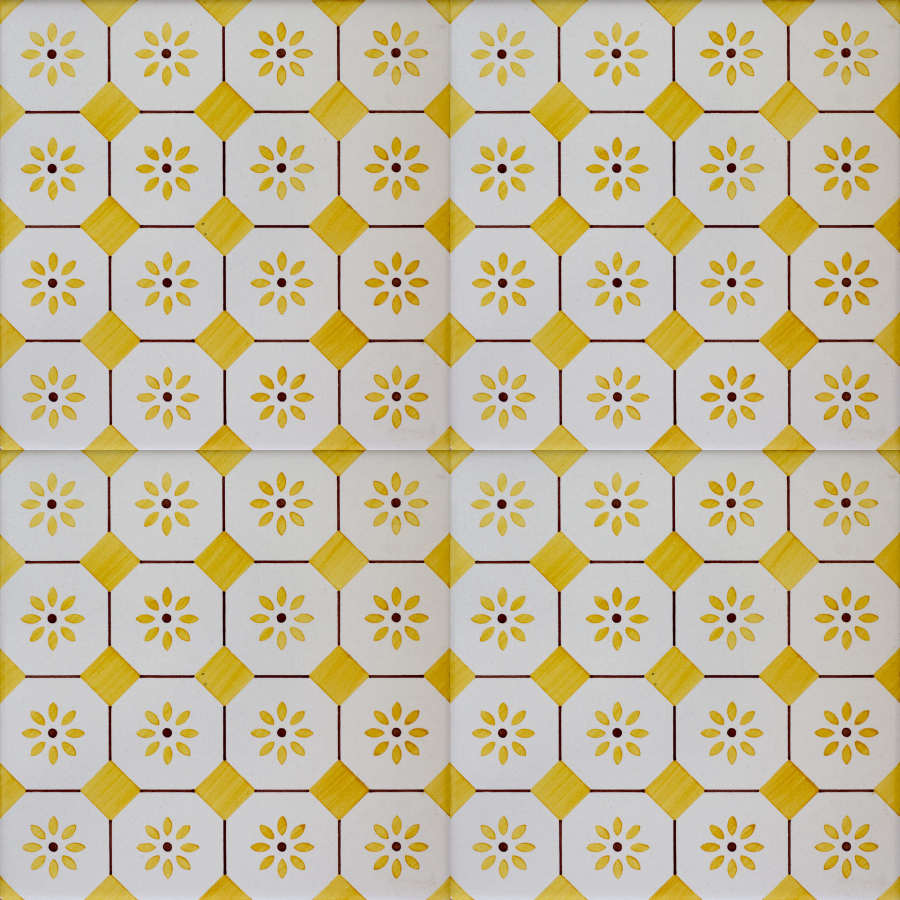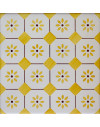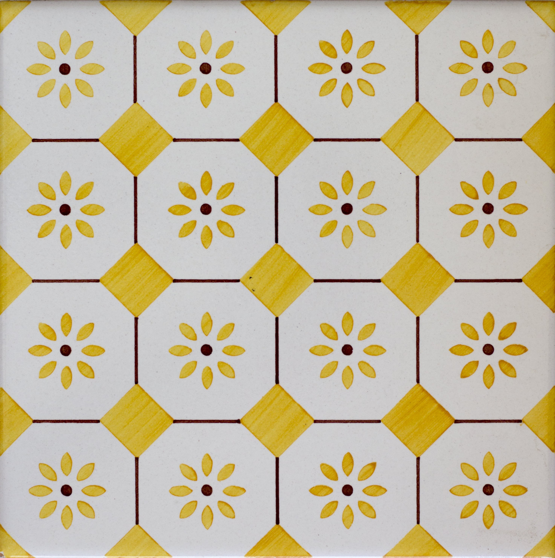 20x20 Mattonella decorata a mano, da posare a pavimento e rivestimento. Realizzabile nei 42 colori in gamma e abbinabile al pennellato e bianco antico. M’ama, non m’ama. Il colore di riferimento è il 279 giallo.