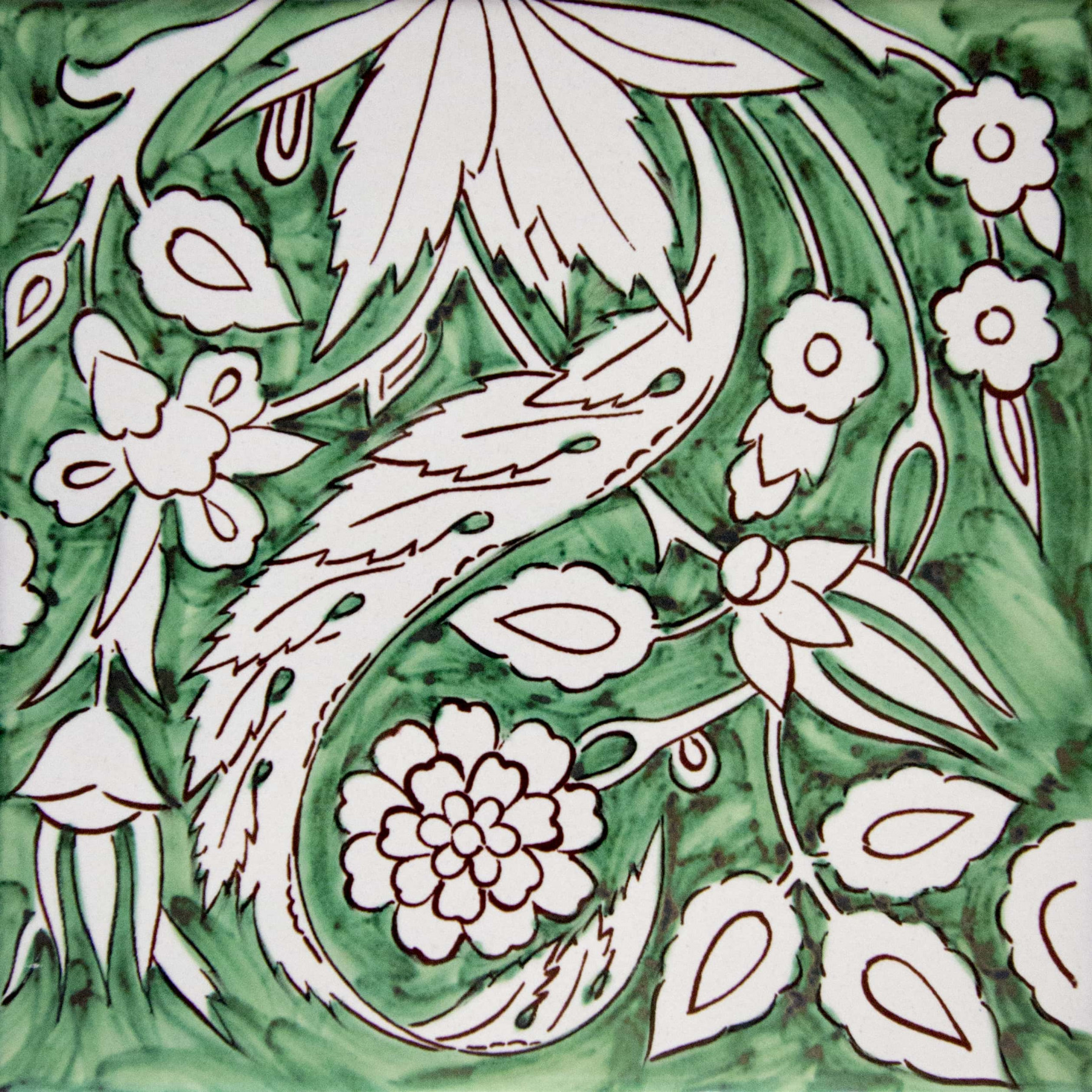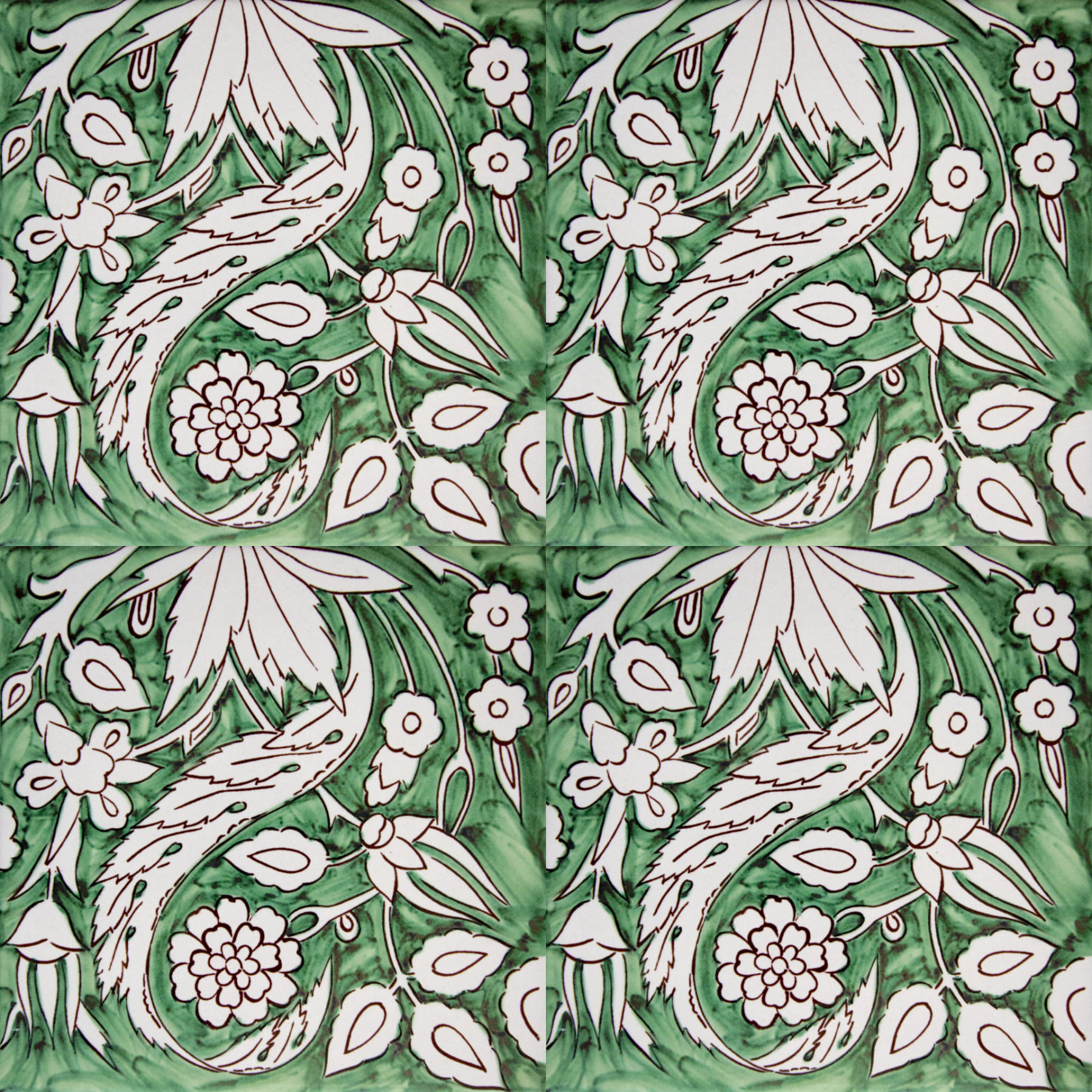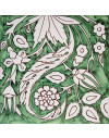 20x20 Mattonella decorata a mano, da posare a pavimento e rivestimento. Realizzabile nei 42 colori in gamma e abbinabile al pennellato e bianco antico. Il colore di riferimento è il verde 140.