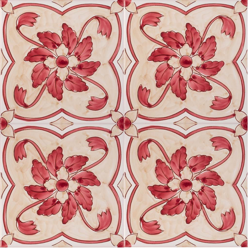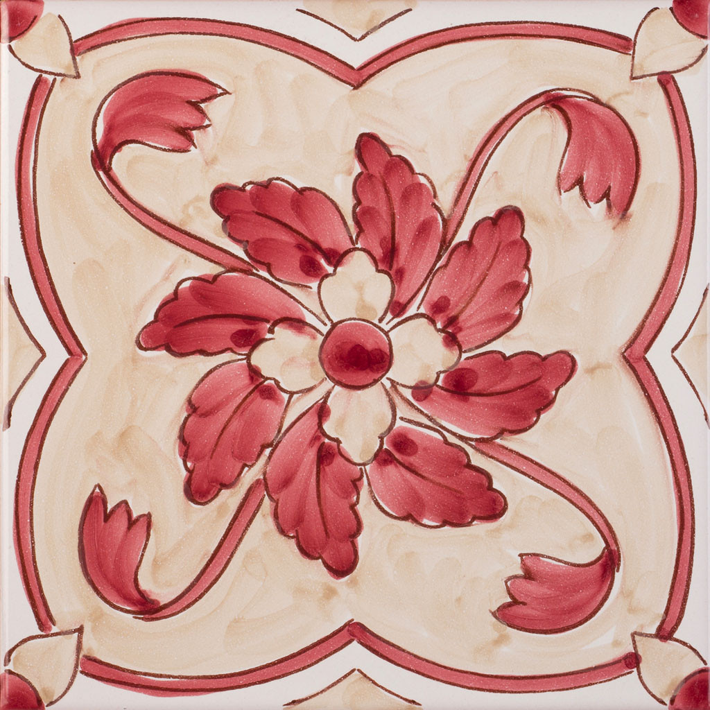 20x20 Mattonella decorata a mano, da posare a pavimento e rivestimento. Realizzabile nei 42 colori in gamma e abbinabile al pennellato e bianco antico. Chi ha visto una volta il cielo di Palermo non potrà mai più dimenticarlo. Il colore di riferimento è il rosso 7, beige 378.