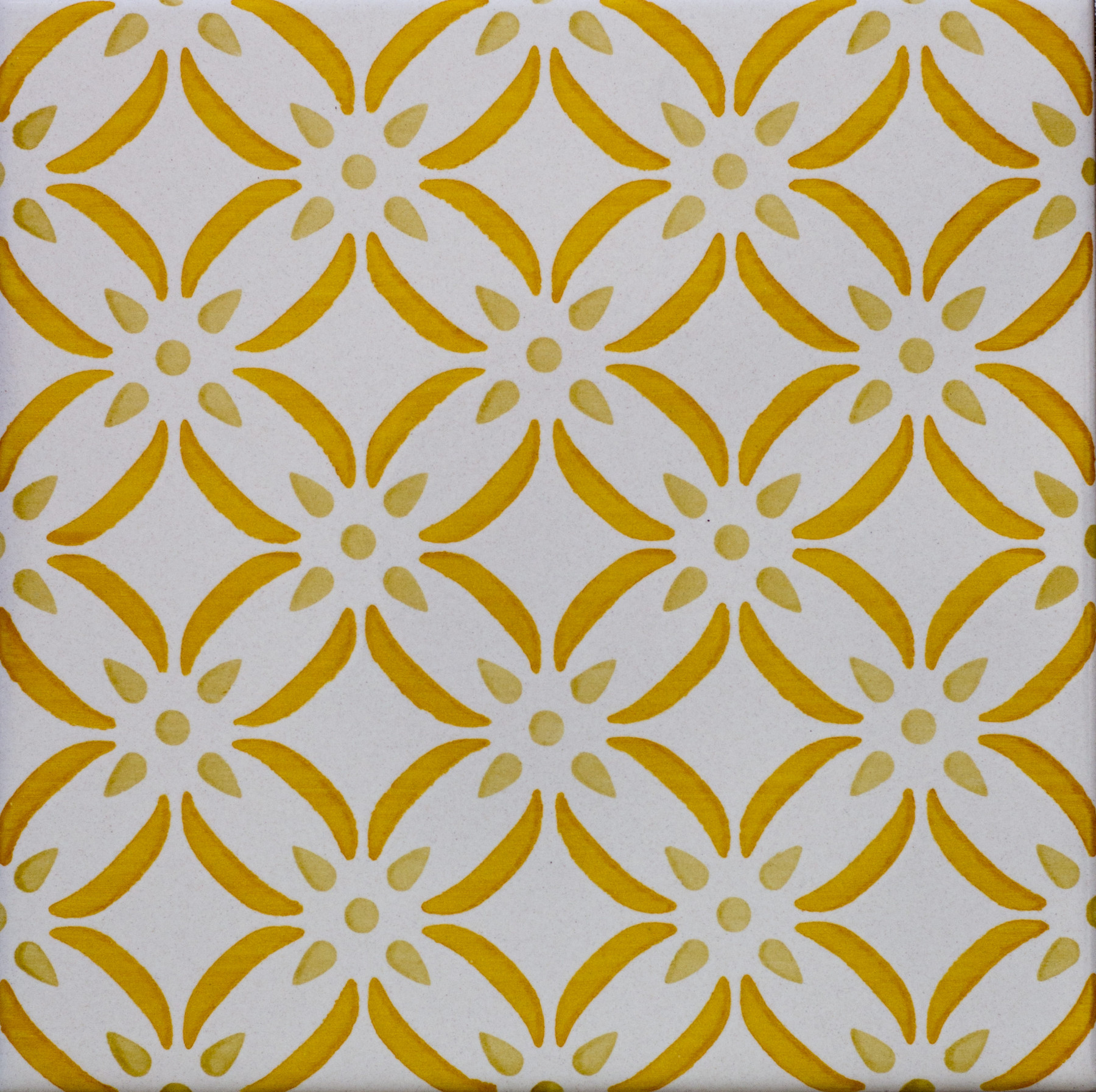 20x20 Mattonella decorata a mano, da posare a pavimento e rivestimento. Realizzabile nei 42 colori in gamma e abbinabile al pennellato e bianco antico. Più grande è l’isola della conoscenza, più lungo è il litorale della meraviglia. Il colore di riferimento è il giallo 279.