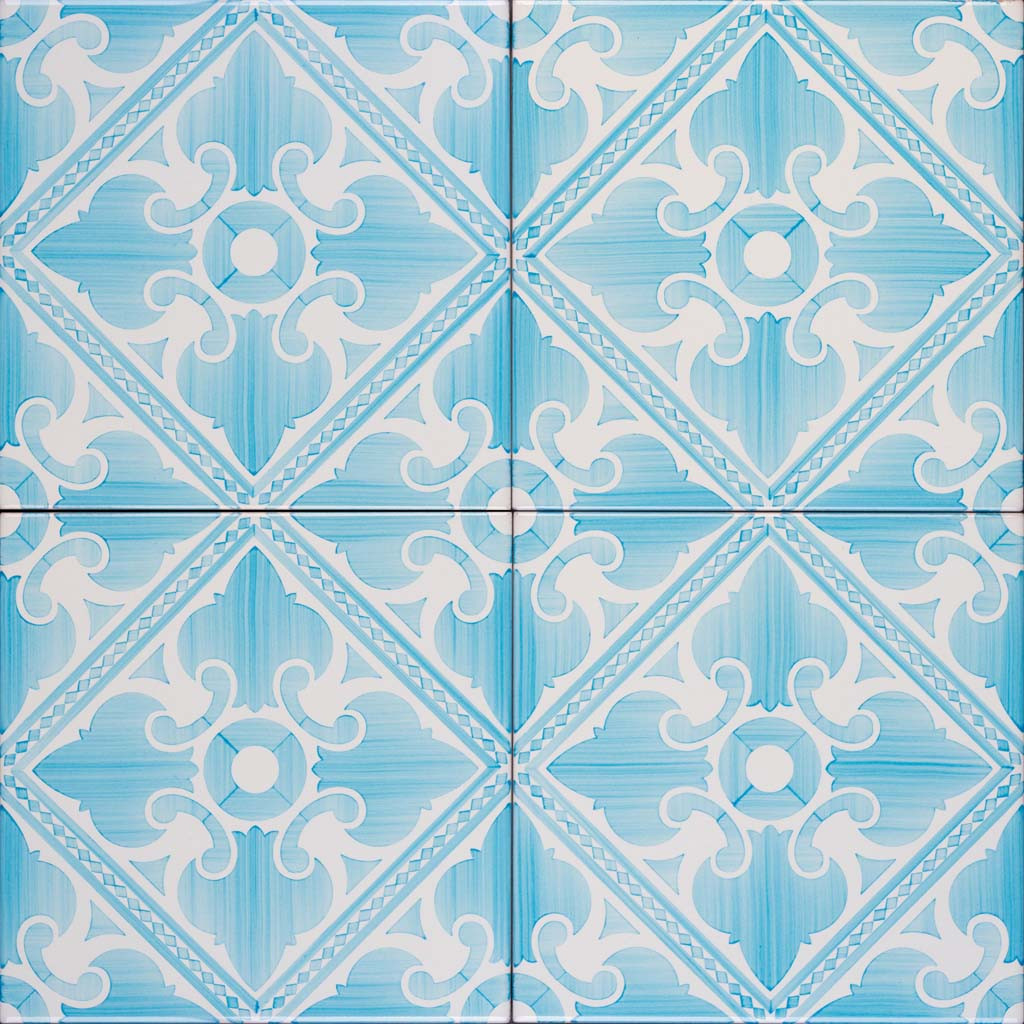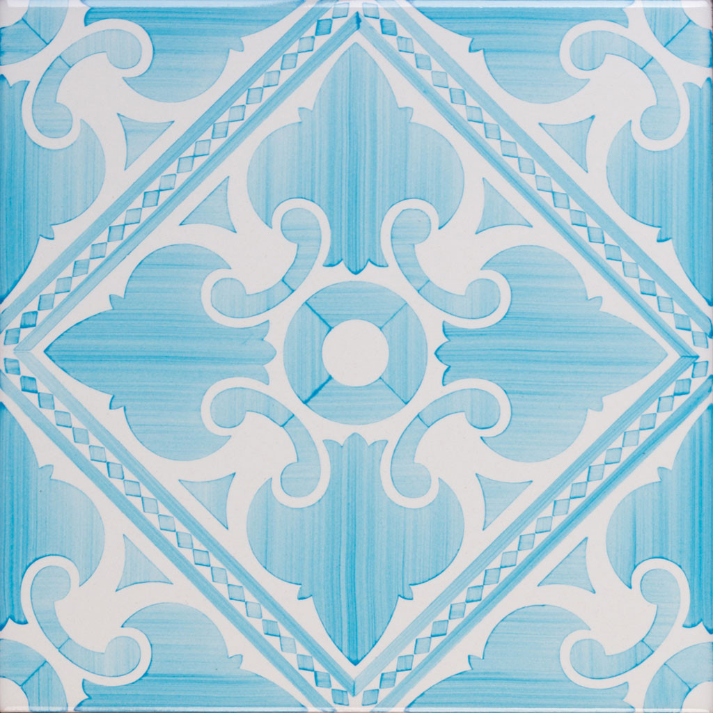 20x20 Mattonella decorata a mano, da posare a pavimento e rivestimento. Realizzabile nei 42 colori in gamma e abbinabile al pennellato e bianco antico. Il paradiso della Val d’Orcia. Il colore di riferimento è il turchese 168.