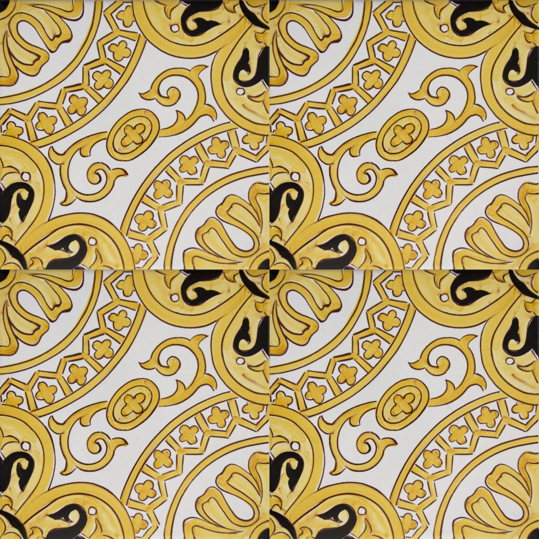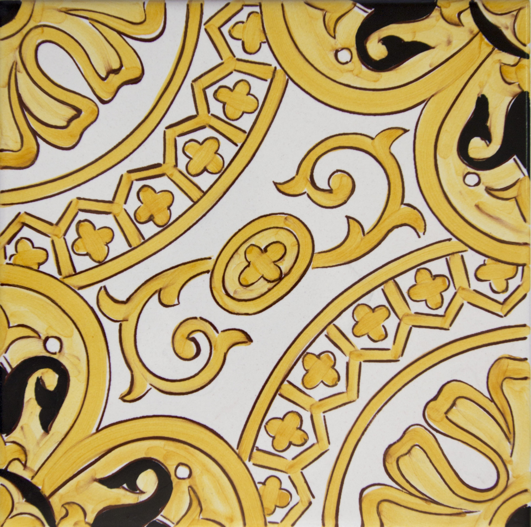 20x20 Mattonella decorata a mano, da posare a pavimento e rivestimento. Realizzabile nei 42 colori in gamma e abbinabile al pennellato e bianco antico. Ritrosa, diffidente e mai prevedibile. Il colore di riferimento è il giallo 279 e il nero 103.