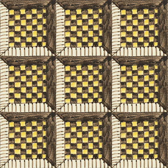 20x20 Mattonella decorata a mano, da posare a pavimento e rivestimento. Realizzabile nei 42 colori in gamma e abbinabile al pennellato e bianco antico. Il colore di riferimento è il manganese 996, giallo 279.