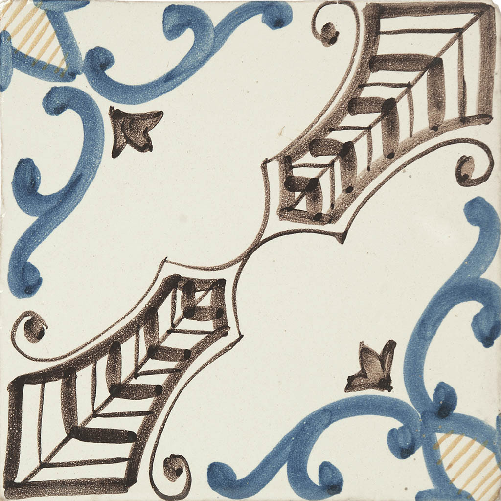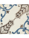 20x20 Mattonella decorata a mano, da posare a pavimento e rivestimento. Realizzabile nei 42 colori in gamma e abbinabile al pennellato e bianco antico. Audaces fortuna adiuvat, Il colore di riferimento è il manganese 996, azzurro 300.