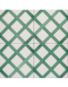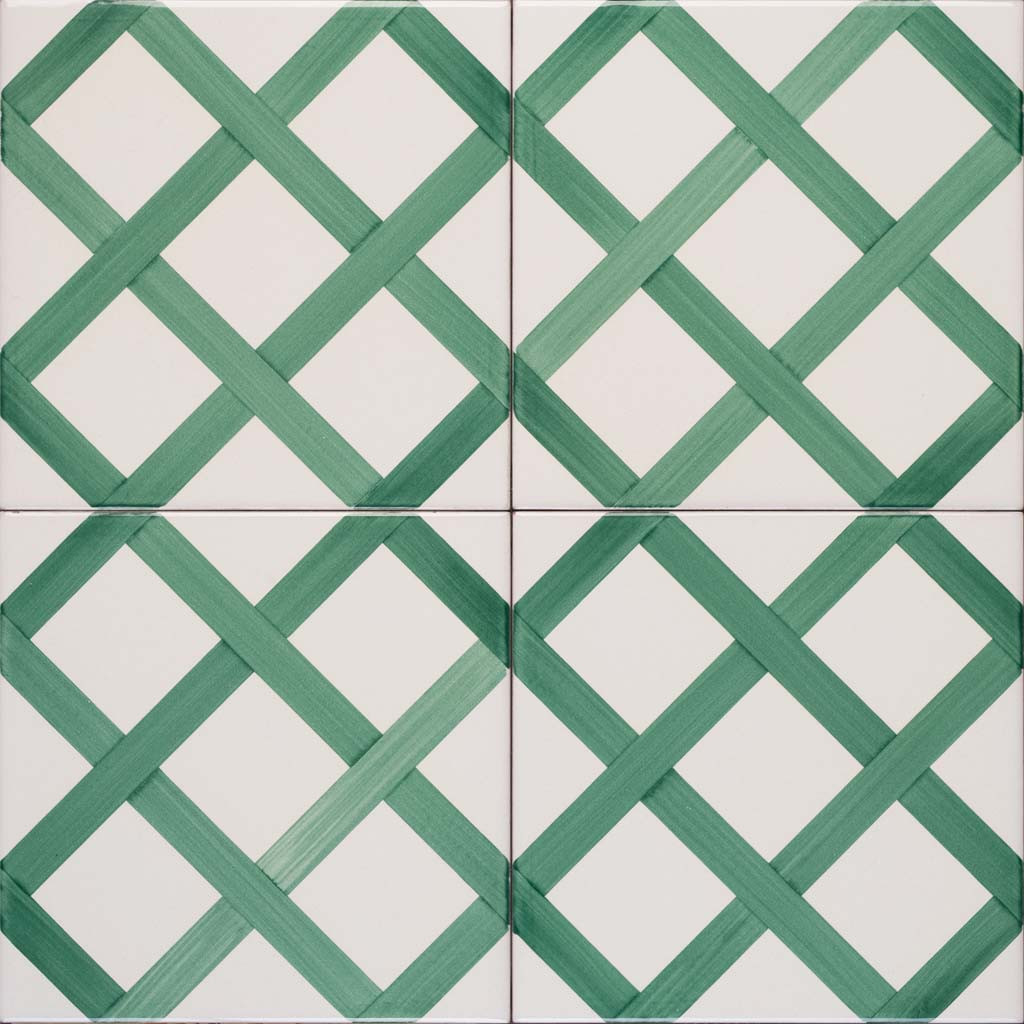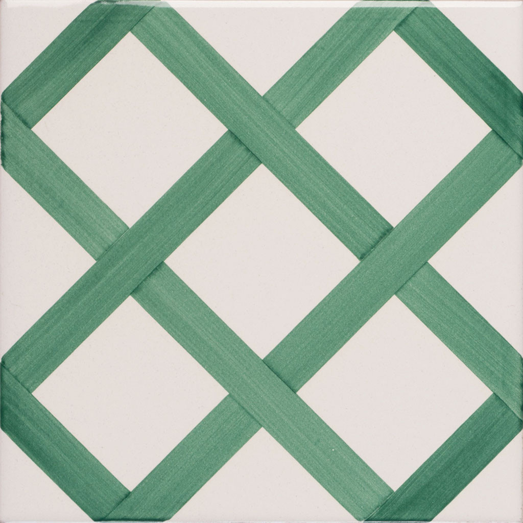 20x20 Mattonella decorata a mano, da posare a pavimento e rivestimento. Realizzabile nei 42 colori in gamma e abbinabile al pennellato e bianco antico. Il colore di riferimento è il verde 140.