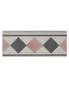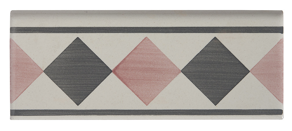 20x8 Listello decorato a mano, inseribile nella parte inferiore delle pareti con funzione di zoccolatura. Abbinabile al Bianco Antico, pennellato e decoro. Il colore di riferimento è il rosa 357,grigio 417.