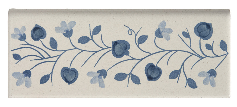 20x8 Listello decorato a mano, inseribile nella parte inferiore delle pareti con funzione di zoccolatura. Abbinabile al Bianco Antico, pennellato e decoro. Il colore di riferimento è il 300 azzurro.