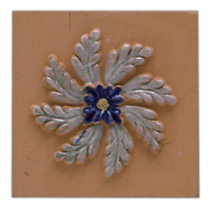 5x5 Tozzetto in rilievo inserito nel Bianco Antico tagliato un lato, posato a rivestimento. Il colore di riferimento è il cotto, 398 e blu 325.