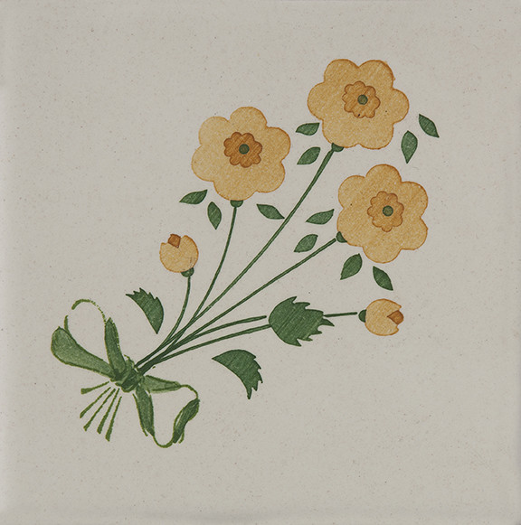 5x5 Tozzetto decorato a mano, inserito nel Bianco Antico o pennellato tagliato un lato, utilizzato sia a pavimento e rivestimento. Il colore di riferimento è il giallo 279.