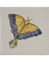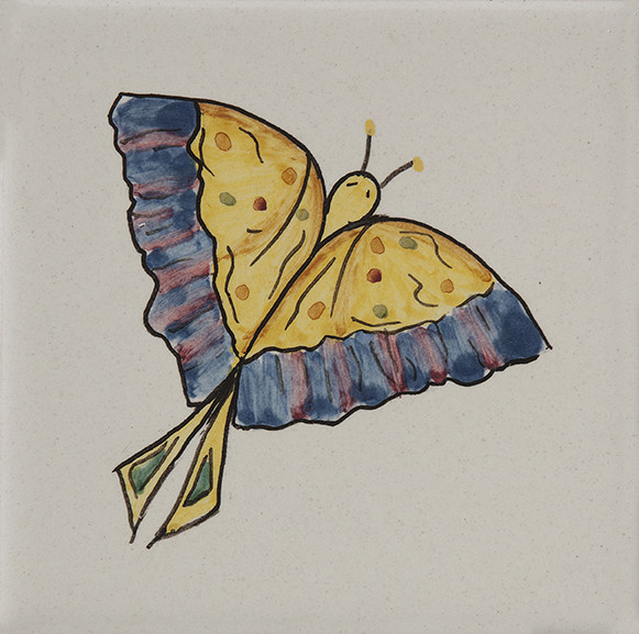 5x5 Tozzetto decorato a mano, inserito nel Bianco Antico o pennellato tagliato un lato, utilizzato sia a pavimento e rivestimento. Il colore di riferimento è il giallo 4, blu 325.