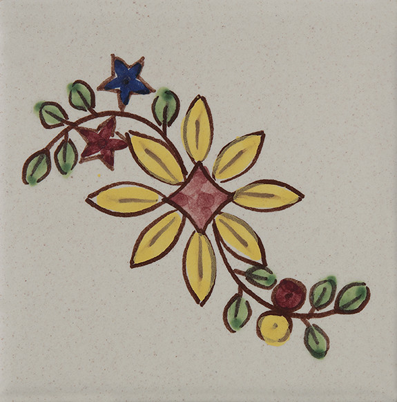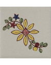 5x5 Tozzetto decorato a mano, inserito nel Bianco Antico o pennellato tagliato un lato, utilizzato sia a pavimento e rivestimento. Il colore di riferimento è il 315 blu, giallo 279.