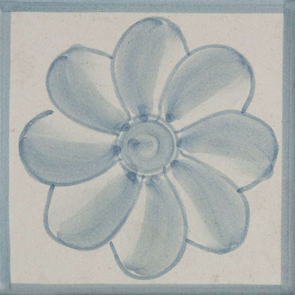 5x5 Tozzetto decorato a mano, inserito nel Bianco Antico o pennellato tagliato un lato, utilizzato sia a pavimento e rivestimento. Il colore di riferimento è il 305 celeste.