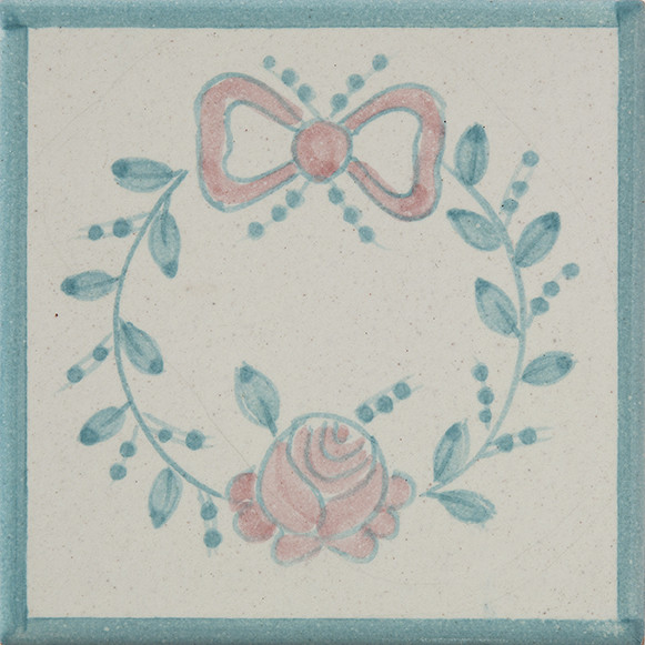 5x5 Tozzetto decorato a mano, inserito nel Bianco Antico o pennellato tagliato un lato, utilizzato sia a pavimento e rivestimento. Il colore di riferimento è il blu 451.